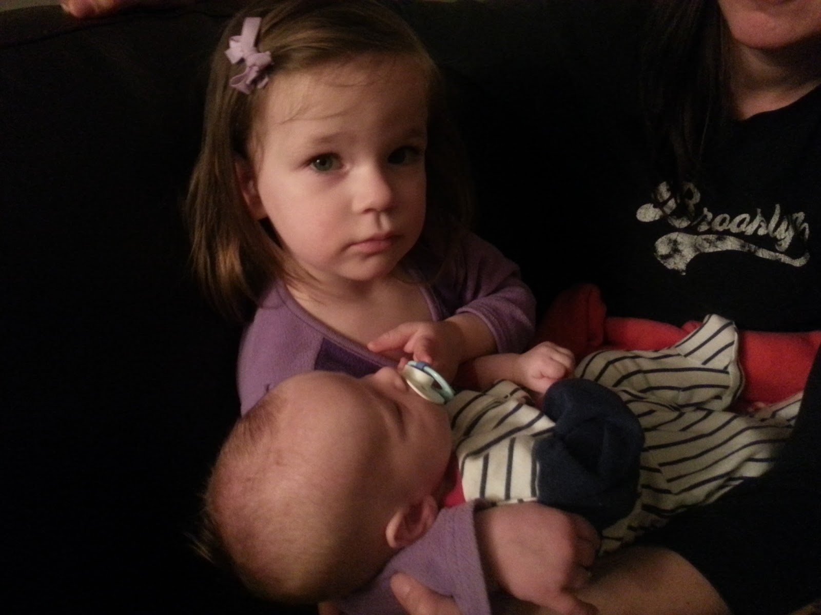 But in we went and I immediately panicked. All I saw was a huge inflatable slide, a face painting station, people walking around selling cotton candy, a petting zoo and a pony ride. I thought we came to the circus, not the zoo!! And all that stuff that I just listed cost extra money. You could look at the animals at the petting zoo, which we did plenty of, but you had to pay to feed them. I eventually saw towards the back of the gym that there was the main circus ring, with a big curtain hung behind it, so I felt a little bit better....there would be more. When it began, the kids didn't know what to think, there was loud music, bright lights, and horses, people riding horses and doing tricks on them! There were acrobats, a clown, a contortionist, bicyclists in a round cage....Hailey ended up loving it all, and Casey warmed up towards the end, signified by him climbing down from my lap and clapping his hands. But, half way through, that smart little daughter of mine turns to me and makes the sounds for elephant and monkey, asking me, "where are they?" I didn't know what to say, so I fumbled and made up a tiny story. I said, they couldn't come today, they were sick and had to stay home. I hope that's not terrible! I knew she was confused, which was all my fault in the first place, and so I felt I needed to give her a reasonable explanation! Poor Hailey, she will go through so many mommy "firsts" with me. But like I said, she had so much fun. She would imitate the performers by doing what they were doing with their arms and hands, saluting to the crowd (similar to the way gymnasts do). And all evening she has been playing circus by dancing around and saluting.