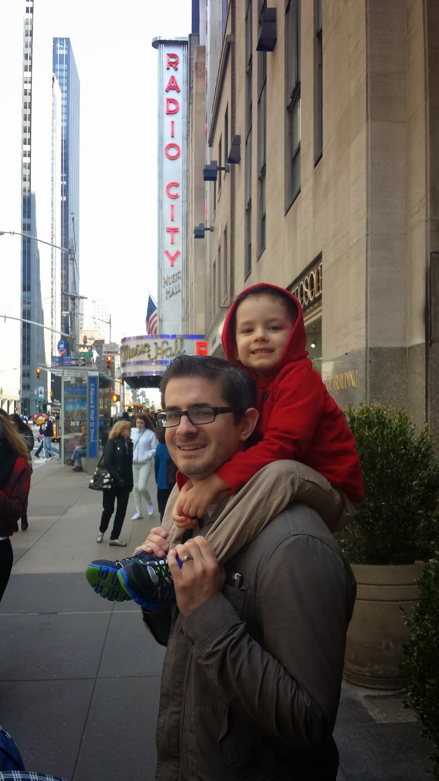 Back at the hotel the kids and I napped from 2-4 (turned away housekeeping who knocked half way through naptime! Someone, ahem, me, forgot the Do Not Disturb sign. Oops) Luke watched the game down in the lobby lounge and came and woke us up a little after 4. We had tickets for the 5pm Rockettes Christmas show, and while trying to quickly feed the kids a snack we realized we would not make it in time if we walked. We got downstairs as fast as we could, walked down the block to a bigger intersection and hailed a cab. Phew. We got there in plenty of time.